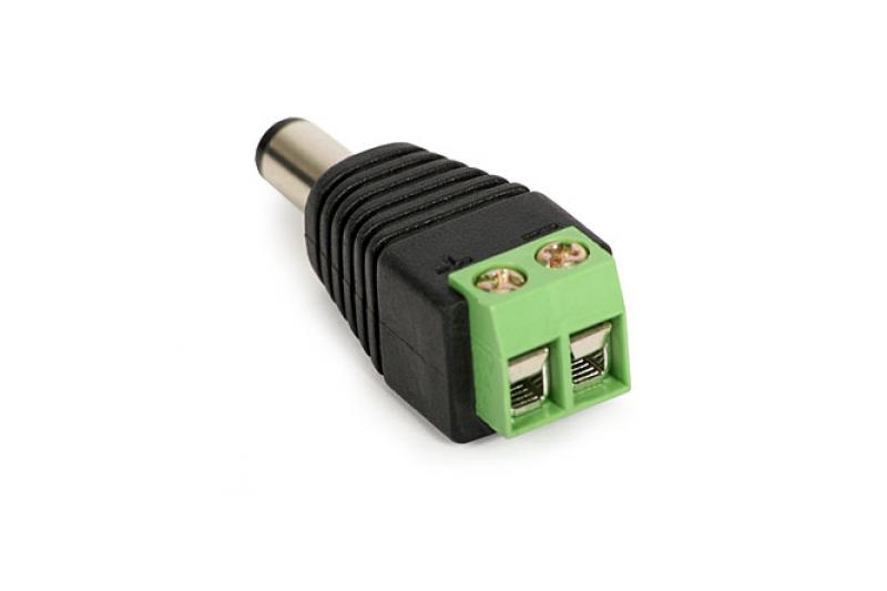 Quick-connect plug connects a two-wire power cable to a standard DC connection (2.1/5.5, for CCTV cameras).