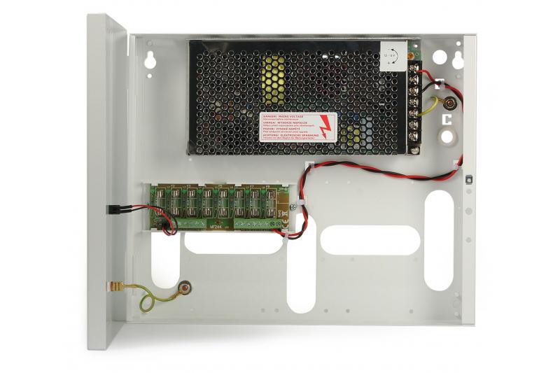 The CAMPSU8HD stabilized power supply has been designed to power devices requiring 12 VDC or similar stabilized voltage (within 12...15 VDC range). Its modern switch-mode converter shows 83% efficiency and provides stable low-noise DC voltage. The 8 outputs (each with 1 A current capacity) are protected with individual fuses. The circuitry is enclosed in metal casing with LED indicator on the front panel.