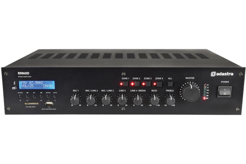 60 Watt 5-channel 19" rack-mountable mixer-amplifier, tailored to commercial sound installations to power 100V line speakers or standard speakers down to a 4 Ohm load. Input options include XLR (with switchable phantom power), mic/line jack, and RCA line. Features an inbuilt DAB /FM radio tuner, front-mounted SD/USB ports, and Bluetooth® connectivity, all controlled via an integrated media player for hassle-free playback. A switchable ‘voiceover’ feature automatically lowers the background music volume when a signal is detected via mic input 1, and rear panel 24V contacts can mute all except mic input 1 when triggered. Outputs on screw terminals are via 4 switchable zones with a separate "always on" output for priority alert speakers.