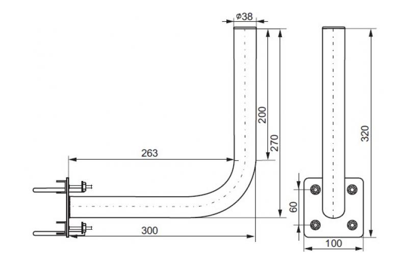 The bracket can be mounted on a vertical or horizontal pipe-like the rail of a balcony or a tv mast using the supplied v bolts (due to two pairs of holes in the corners of a square). The U-bolts and nuts use M8 thread. Total weight of the bracket : 1.21 kg.