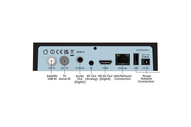 • 1x Mini AV • 1x HDMI • 1x LNB In • 1x ANT In • 2x USB 2.0 Port |