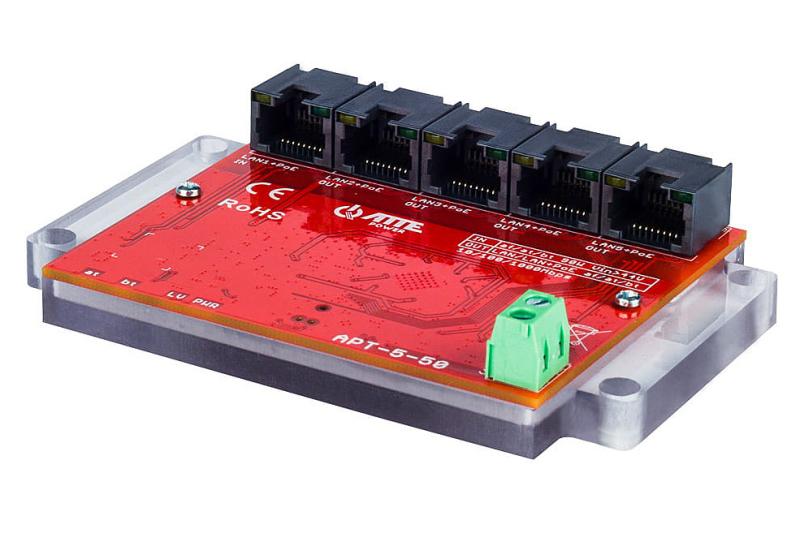 The APT-5-50 is a gigabit PoE network switch that acts as an extender (repeater) of the LAN and PoE power supply. It is most often used in situations where several network devices (e.g. several IP cameras) need to be connected on a single UTP cable, or where an additional network branch is required.