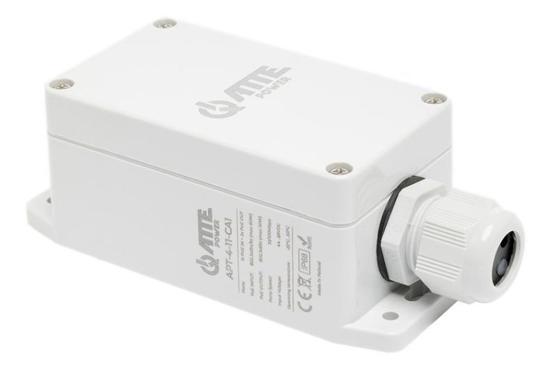 The APT-4-11-CA1 is a PoE network switch acting as an extender (repeater) of the LAN and PoE power supply.