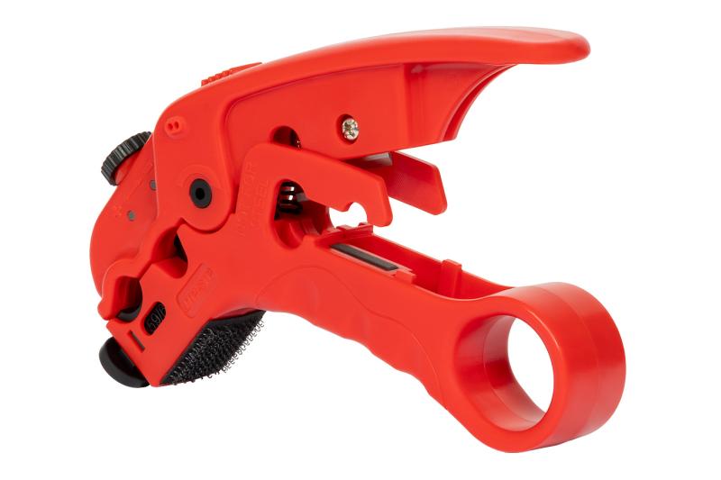 The device is equipped with two adjustable cutters for RG-59, RG-6, RG-11, TRISET and telephone cables.